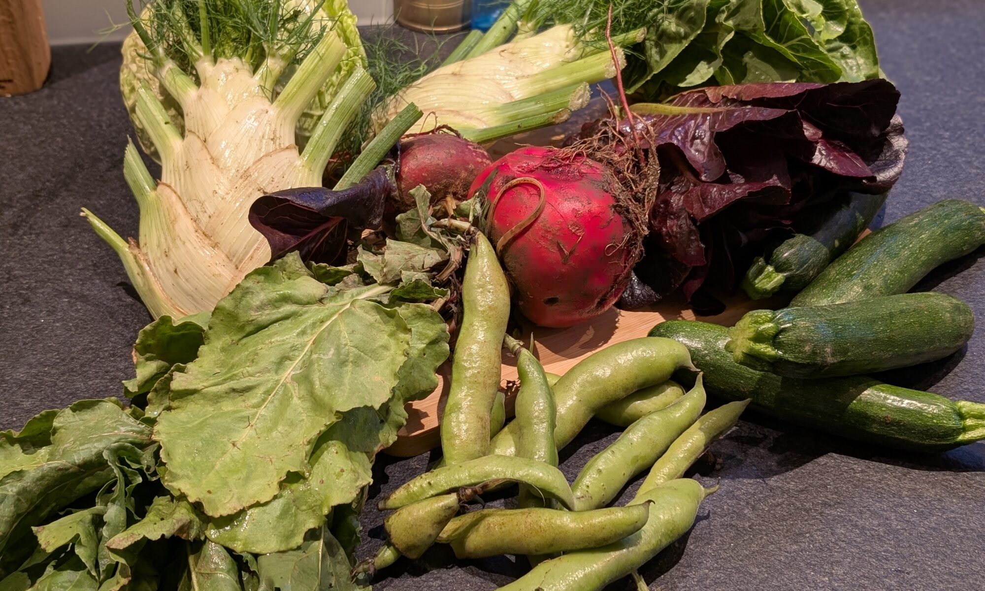 Zucchini wird es ab jetzt voraussichtlich jede Woche geben – wenn die Pflanzen mitmachen. Leider zeigt sich schon etwas falscher Mehltau, weshalb es diese Woche etwas weniger Zucchini gibt als zuletzt. Die Pflanzen schwächeln aktuell etwas, aber wir tun alles dafür, dass sie wieder zu Kräften kommen.