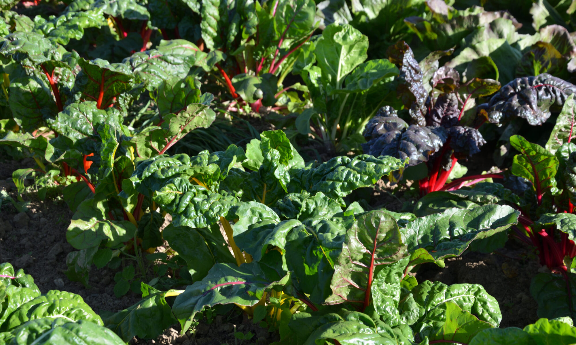 Bunter Rainbow-Mangold, frisch und zart geschnitten. Es ist der zweite Aufwuchs des späten Satzes – jetzt geerntet, bevor möglicher Frost ihn schädigt.